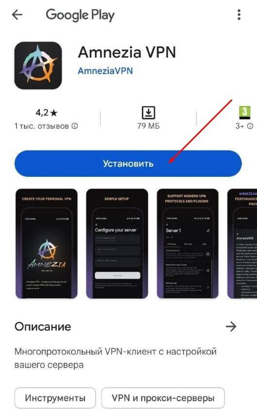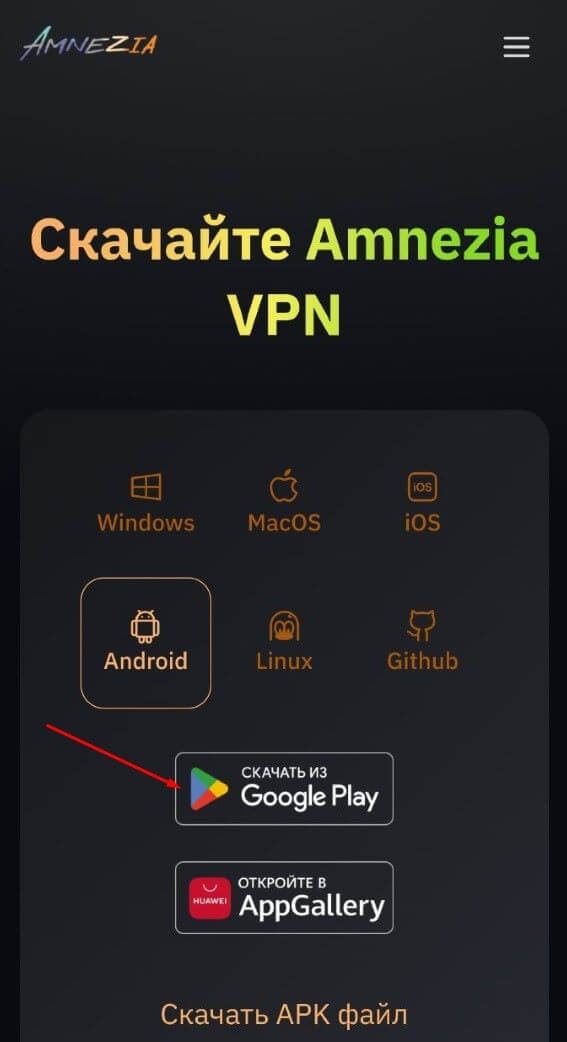 Откройте официальный сайт Amnezia в мобильном браузере, выберите платформу Android и нажмите «Скачать из Google Play» или загрузите установочный apk-файл напрямую.