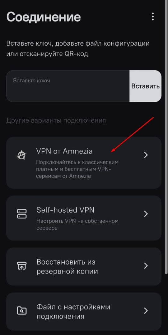 Нажмите «VPN от Amnezia», чтобы выбрать сервер и подключиться к серверу.